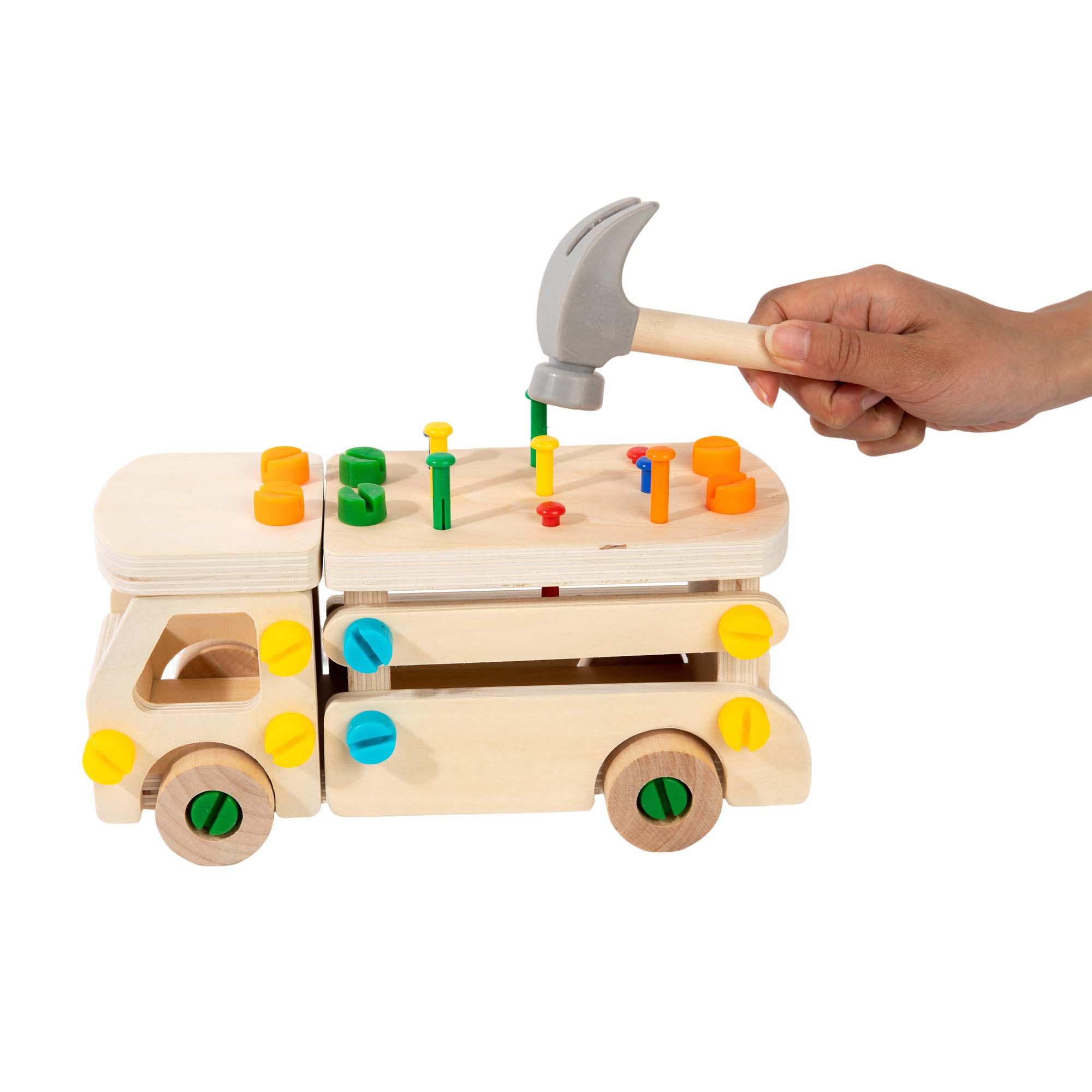 Contents: Includes a wooden fire truck, colorful screws, bolts, nails, and matching tools such as a wooden screwdriver and hammer.